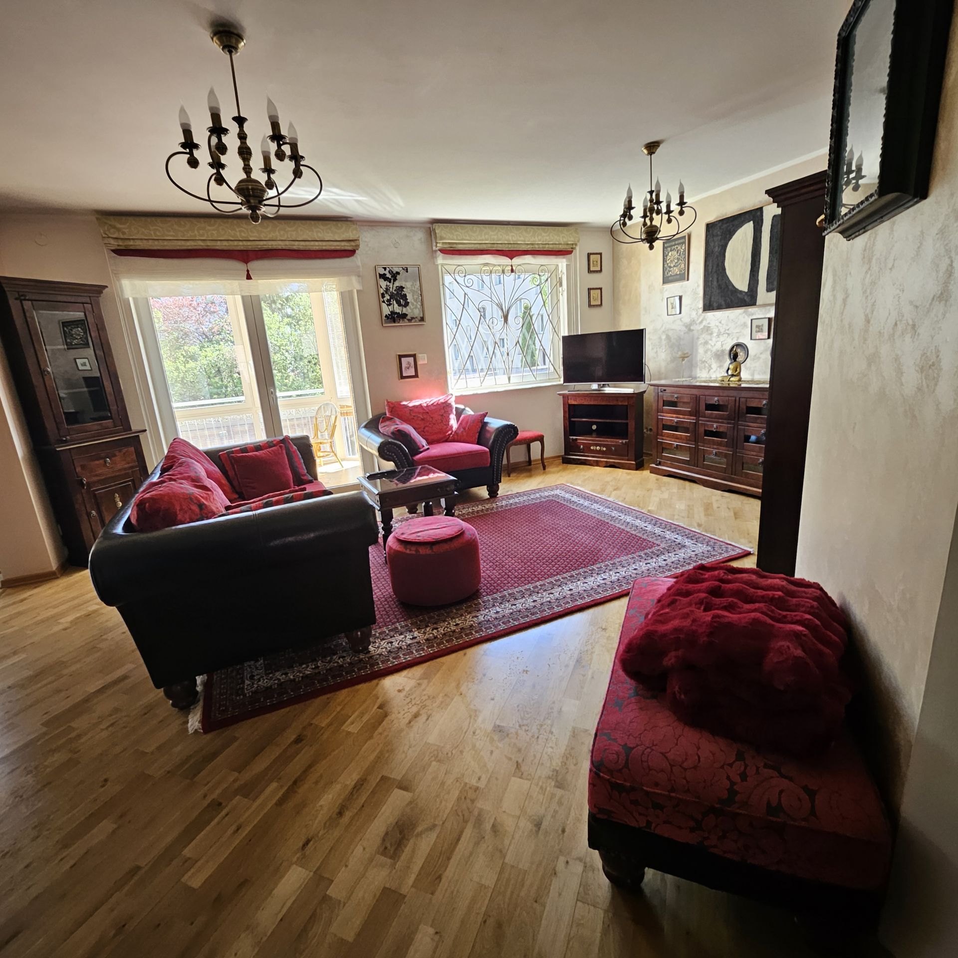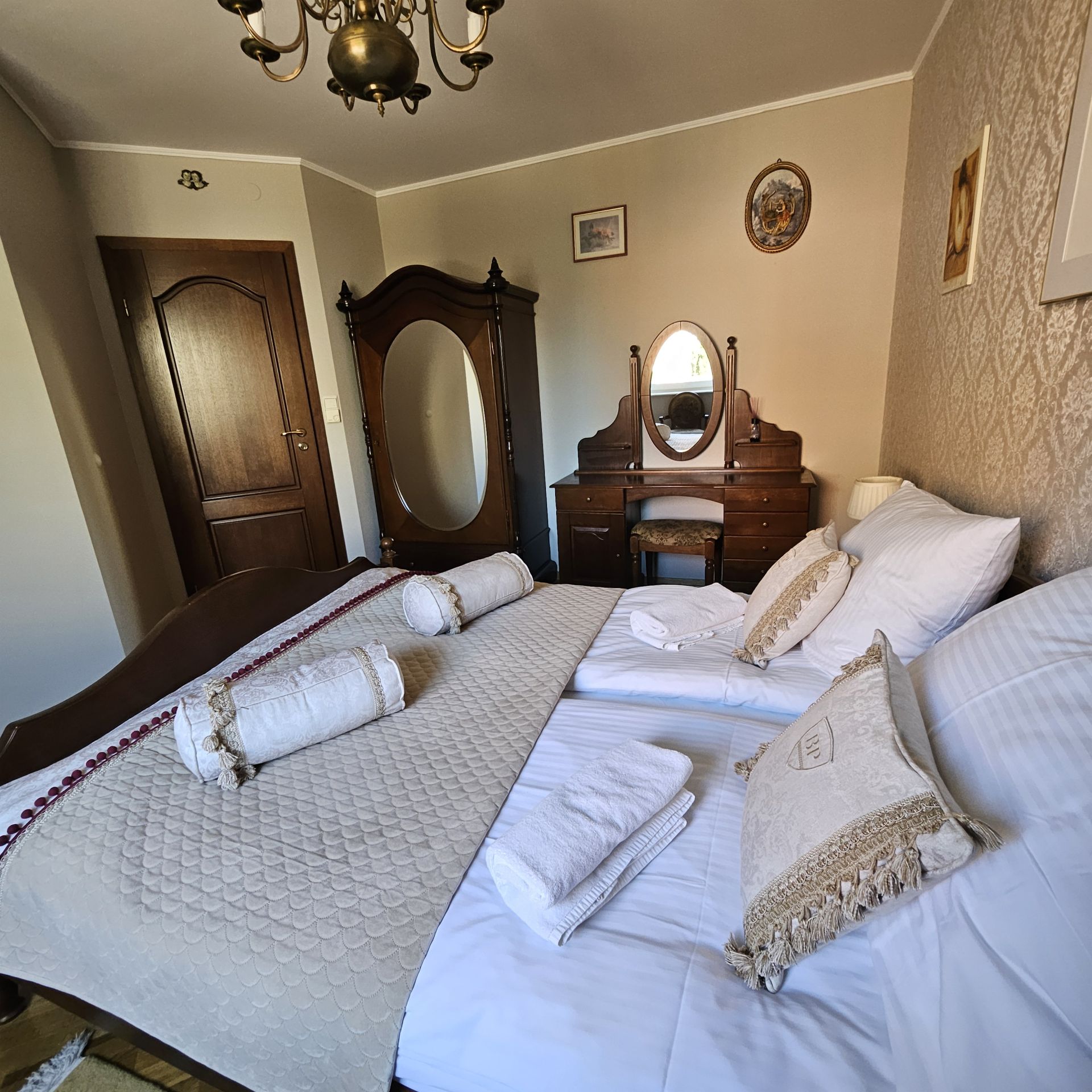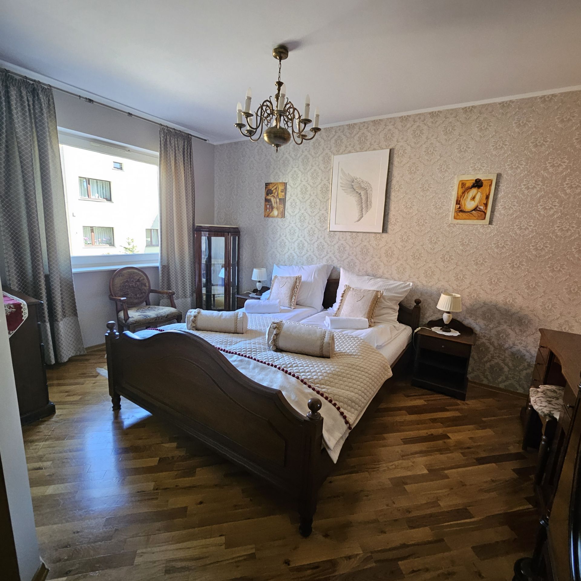 -sypialnia: łóżko King Size o szerokości 160cm dla 2 osób, 2 kpl pościeli,komoda,stoliki nocne,lampki.